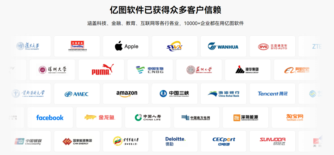 现在 ,亿图软件已与阿里巴巴、比亚迪、科大讯飞、中国南方电网等海内着名企业告竣合作 ,相关用户笼罩科技、金融、教育、互联网、咨询等行业;别的 ,亿图软件也与复旦大学、深圳大学、南方科技大学、首都医科大学等着名高校坚持恒久合作。