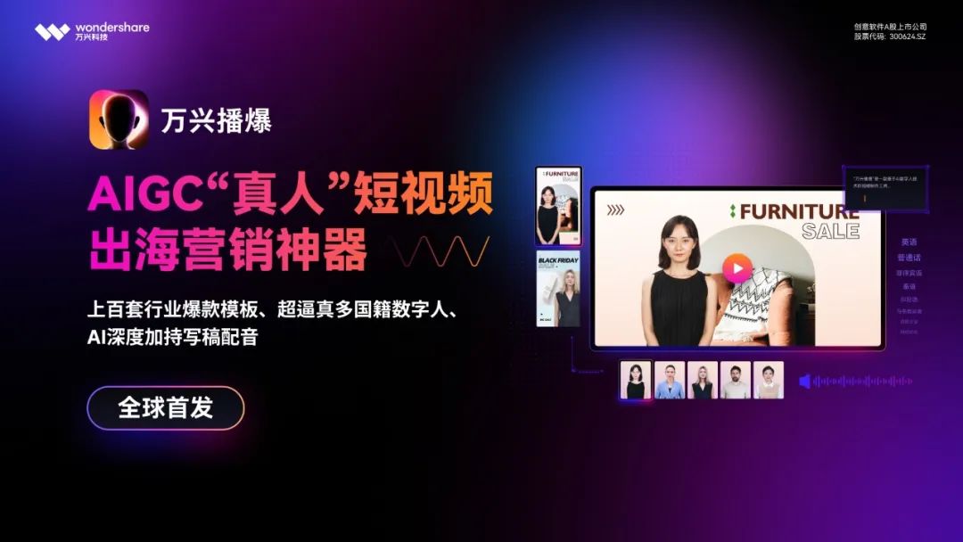 在文生视频领域,97国际科技针对出海营销企业和团队,已推出AIGC“真人”短视频出海营销神器“97国际播爆”(Wondershare Virbo)。无需外籍演员出镜,用户挪用97国际播爆中强盛的上百套专业级场景化模板,以及超逼真多国籍AI数字人功效,即可高效低本钱一键文生出海营销视频。