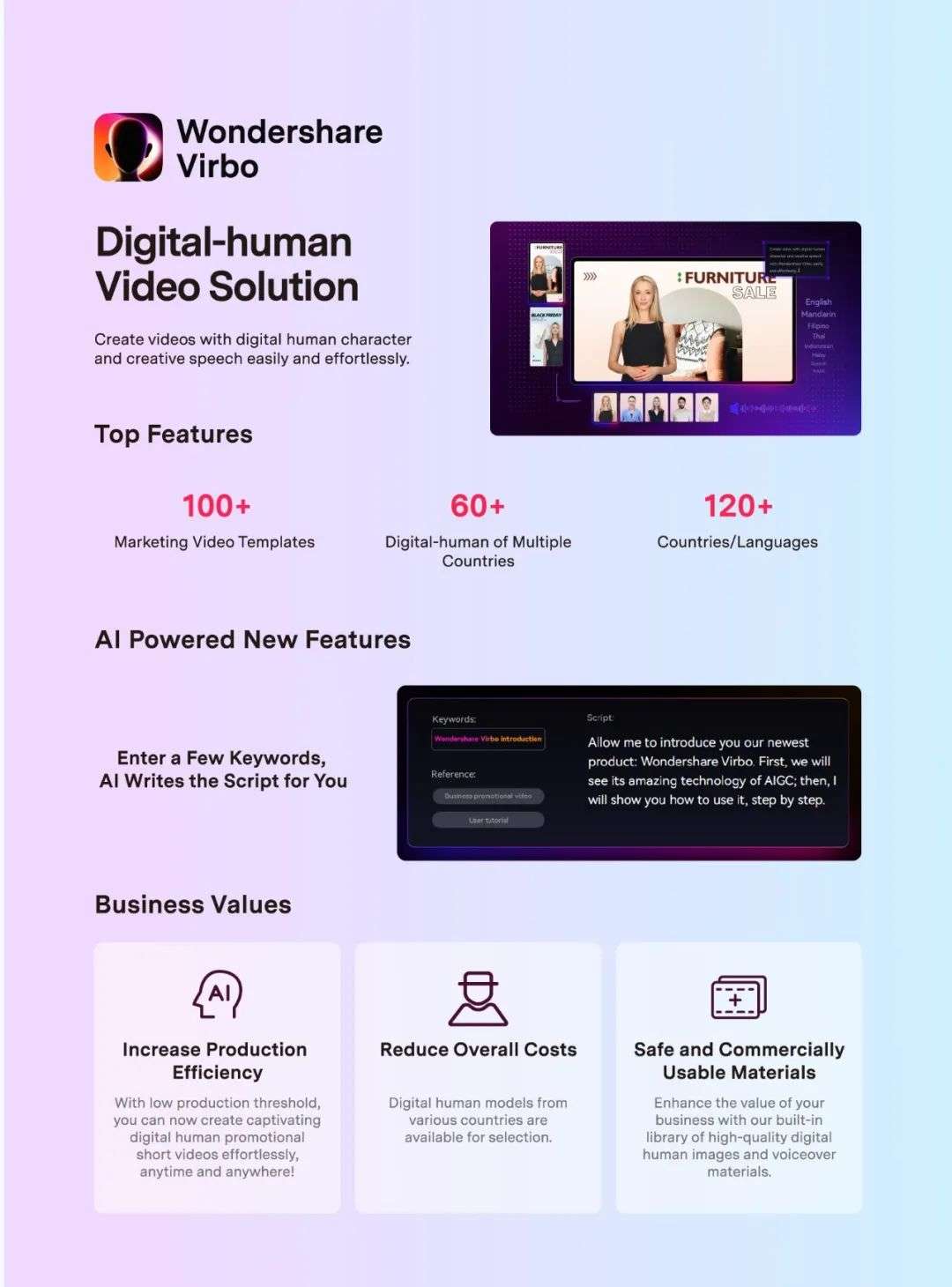 Wondershare VirboÒÑÈ«ÐÂÍÆ³ö¡°0Ãż÷AIÌìÉú¾ç±¾¡±¹¦Ð§£¬ÎªÓû§´øÀ´´Ó¾ç±¾¡¢µ½¡°ÕæÈË¡±³ö¾µ¡¢µ½ÊÓÆµ×Ô¶¯ÌìÉúµÄ¡°È«Á´Â·AIGC´´×÷¡±ÌåÑé¡£Óû§ÊäÈëÒªº¦´Ê£¬¼´¿ÉÒ»¼üÌìÉúÓªÏúÎݸ£¬´ó´ó½ÚÔ¼ÁËÔÚÎݸ¹¹ÏëÉÏãýÃðµÄʱ¼äÓ뾫Éñ£¬²¢½â¾ö¶àÓïÑԾ籾·­ÒëµÈÄÑÌâ¡£